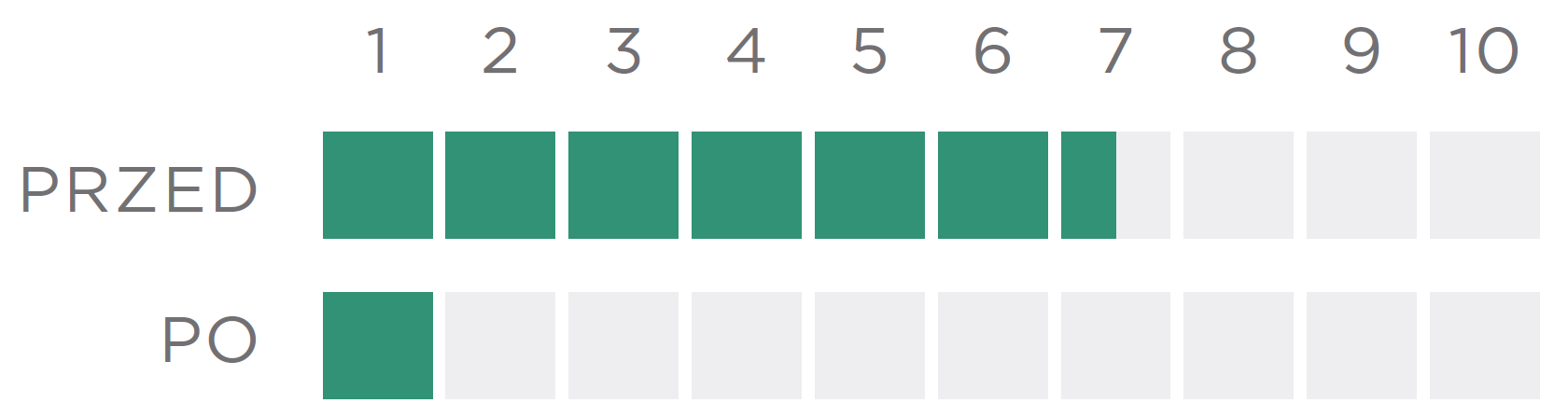 Grafiki przedstawiają redukcję dolegliwości bólowych po 5−10 terapiach z wykorzystaniem BTL SIS. Wyniki przedstawione są za pomocą skali VAS. 87% uczestników badania opisało wyraźne zmniejszenie dolegliwości bólowych*.